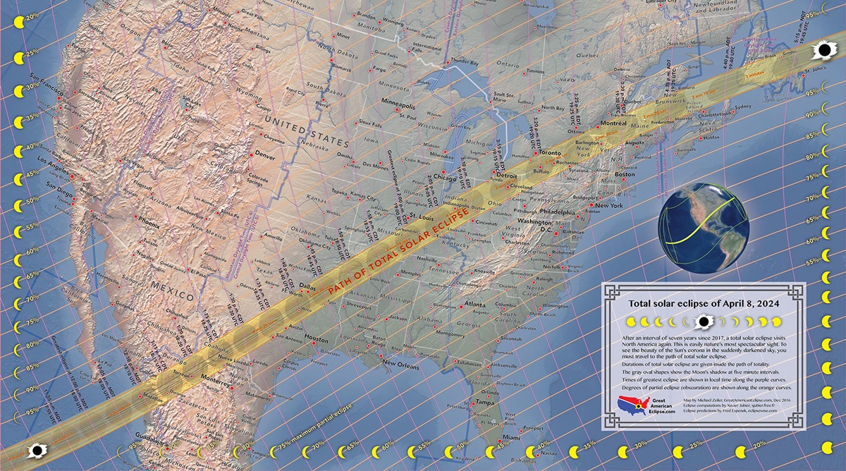 Image courtesy of NASA2024년 4월 8일,미국 일부 지역에서 개기일식이 관측됩니다. 달이 지구와 태양 사이에 완벽하게 일직선으로 위치하면서 지구의 일부 지역에 그림자가 드리워져 낮 동안 어둠에 잠기는 희귀한 천체 현상이 발생합니다. 이 특별한 현상은 미국 15개 주에서 관측 가능하며, 개기일식 동안 어둠이 내려앉으면서 낮 동안 별을 관측할 수 있는 특별한 기회를 제공합니다.